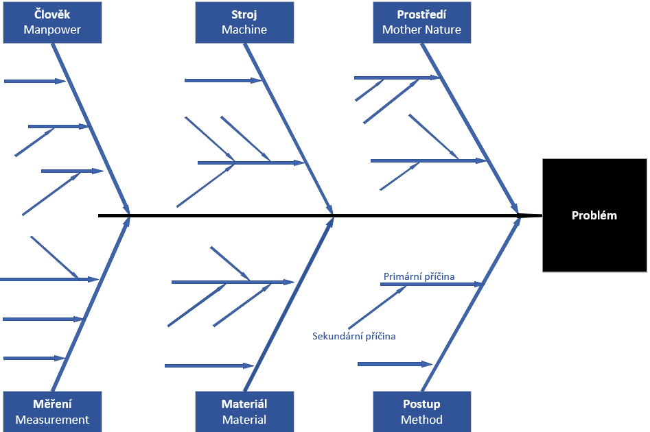 Tento diagram, známý také jako rybí kost, je vizuální nástroj pro analýzu příčin a následků. Umožňuje systematicky prozkoumat všechny potenciální příčiny problému a jejich vzájemné vztahy.